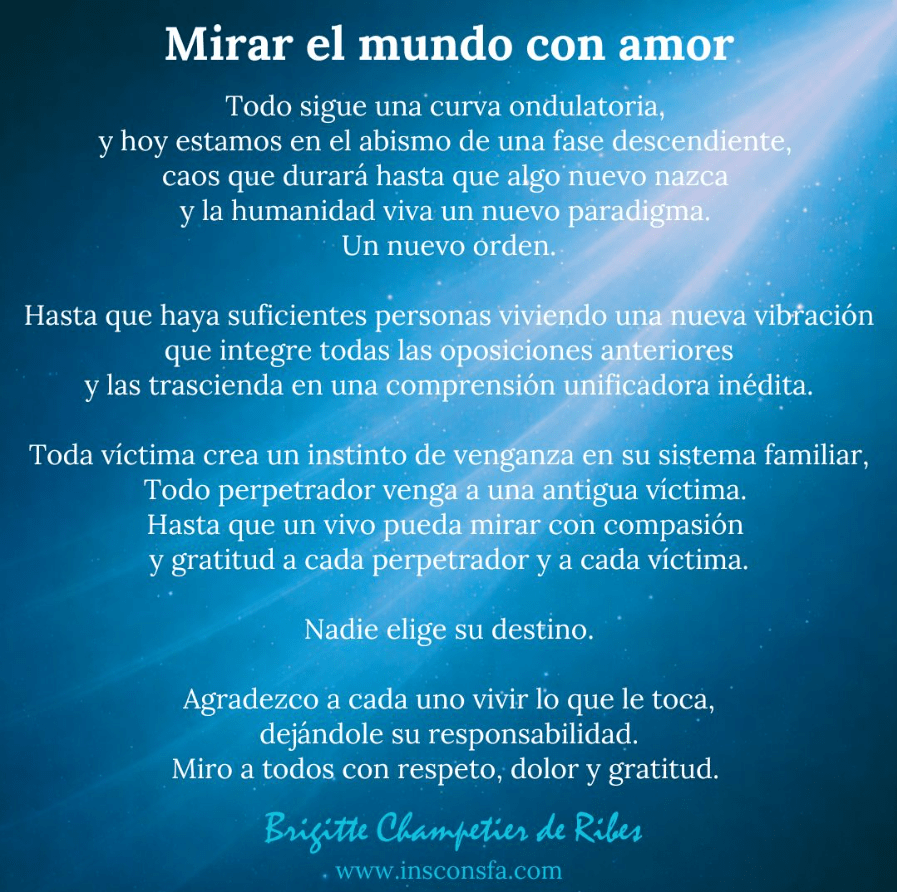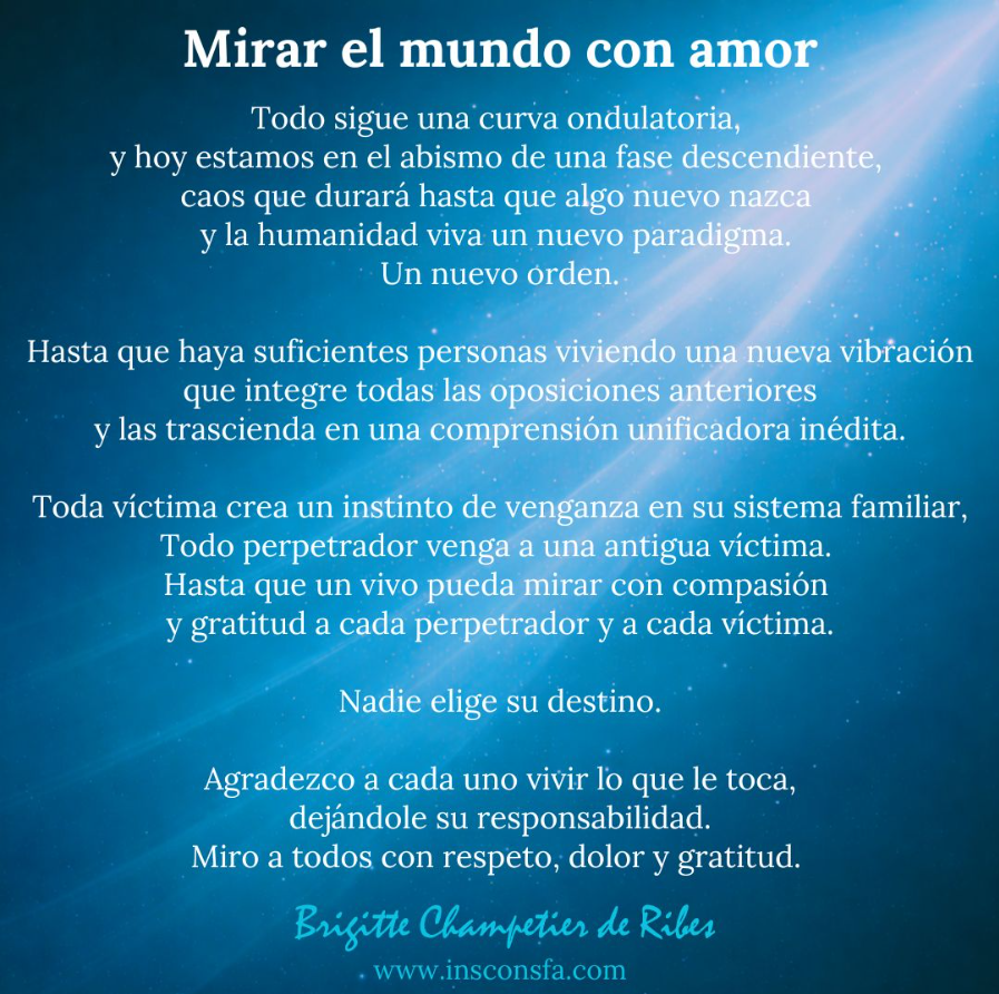 Pues ya ves cómo está el panorama. Entras en el juego de los Sims, te formas un guion de vida, adoptas una serie de creencias que filtran la manera en la que percibes el mundo y empiezas a juzgar. Te crees mucho que tu misión es un tema profesional, o familiar también, pero no te das cuenta de que la misión de una vida se comprende tras una larga trayectoria, que está centrada en el amor a tus semejantes y que esos semejantes lo son más cuanto más cercanos los sientes, hasta el punto de poder comprender que «les ha tocado» una misión, un destino, y que es eso lo que pueden hacer y no otra cosa.
